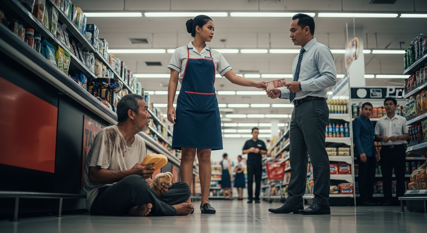 Lumingon ang lahat ng namimili. Nakita ko ang mayabang na Store Manager na si Mr. Castro. Marahas niyang kinakaladkad ang isang matandang lalaki na nakasuot ng punit-punit at maduming damit. Ang matanda ay nanginginig, walang sapin sa paa, at mahigpit na nakayakap sa isang balot ng murang tasty bread.