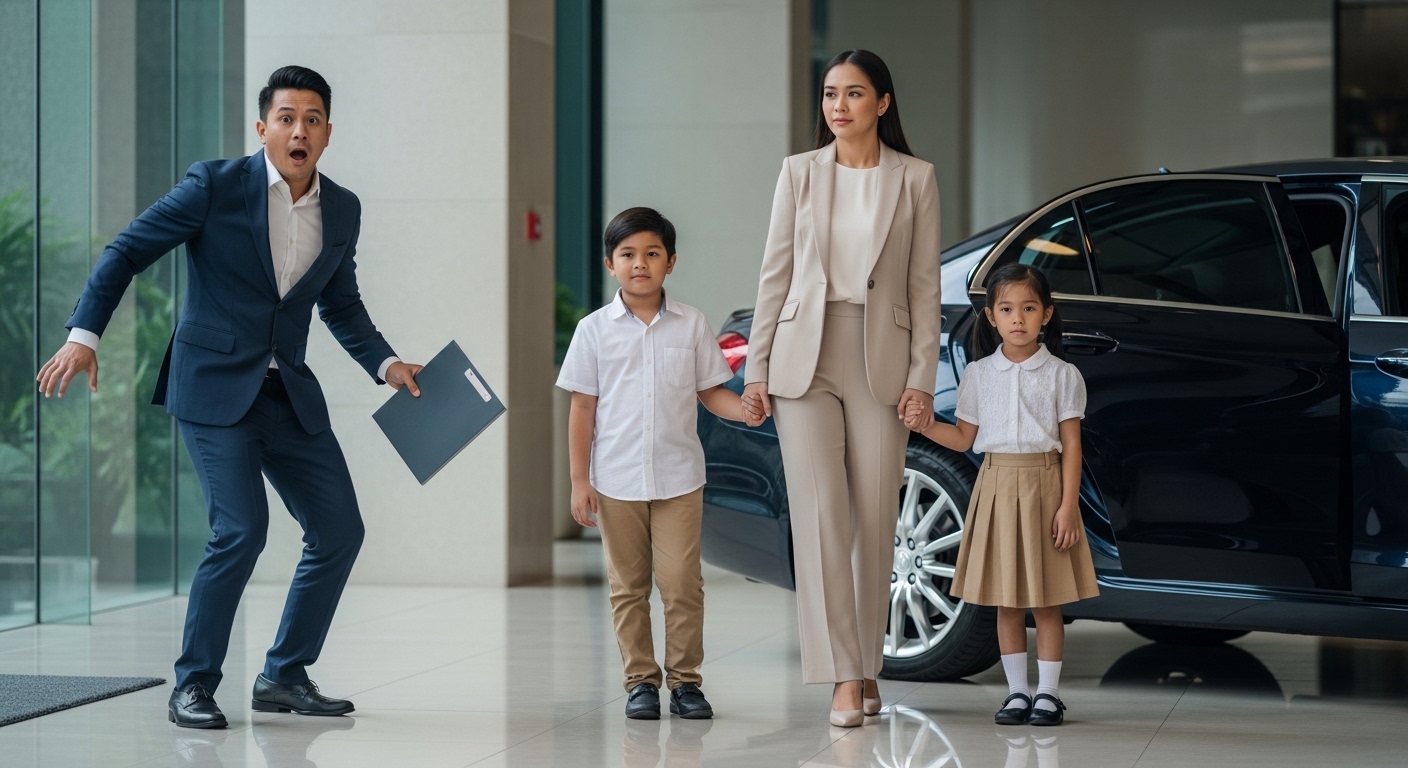Pero hindi siya nag-iisa. Nakahawak sa magkabilang kamay niya ang dalawang batang nasa anim na taong gulang—isang lalaki at isang babae na nakasuot ng mamahaling damit. Ang kambal.