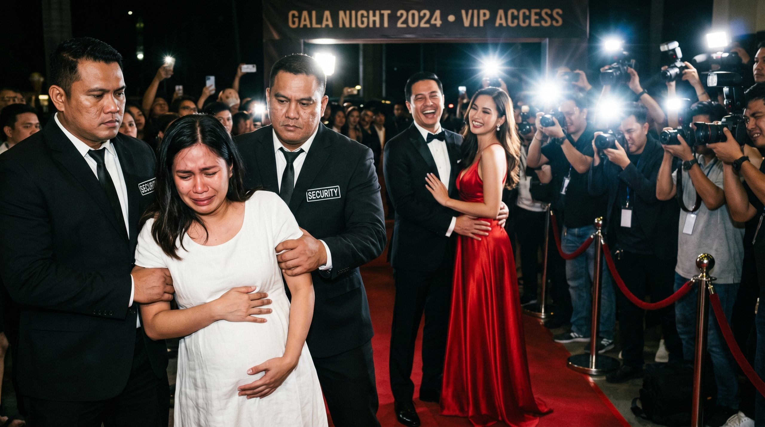 “Excuse me, security!” malakas na sigaw ni Troy, sapat para marinig ng mga reporters. “Bakit niyo pinapasok ang assistant ko sa red carpet?! Pinabibitbit ko lang sa kanya ang mga gamit ko! Buntis ‘yan at wala sa katinuan, ilabas niyo siya rito! Baka makasira pa siya sa mga litrato namin ng mapapangasawa ko!”