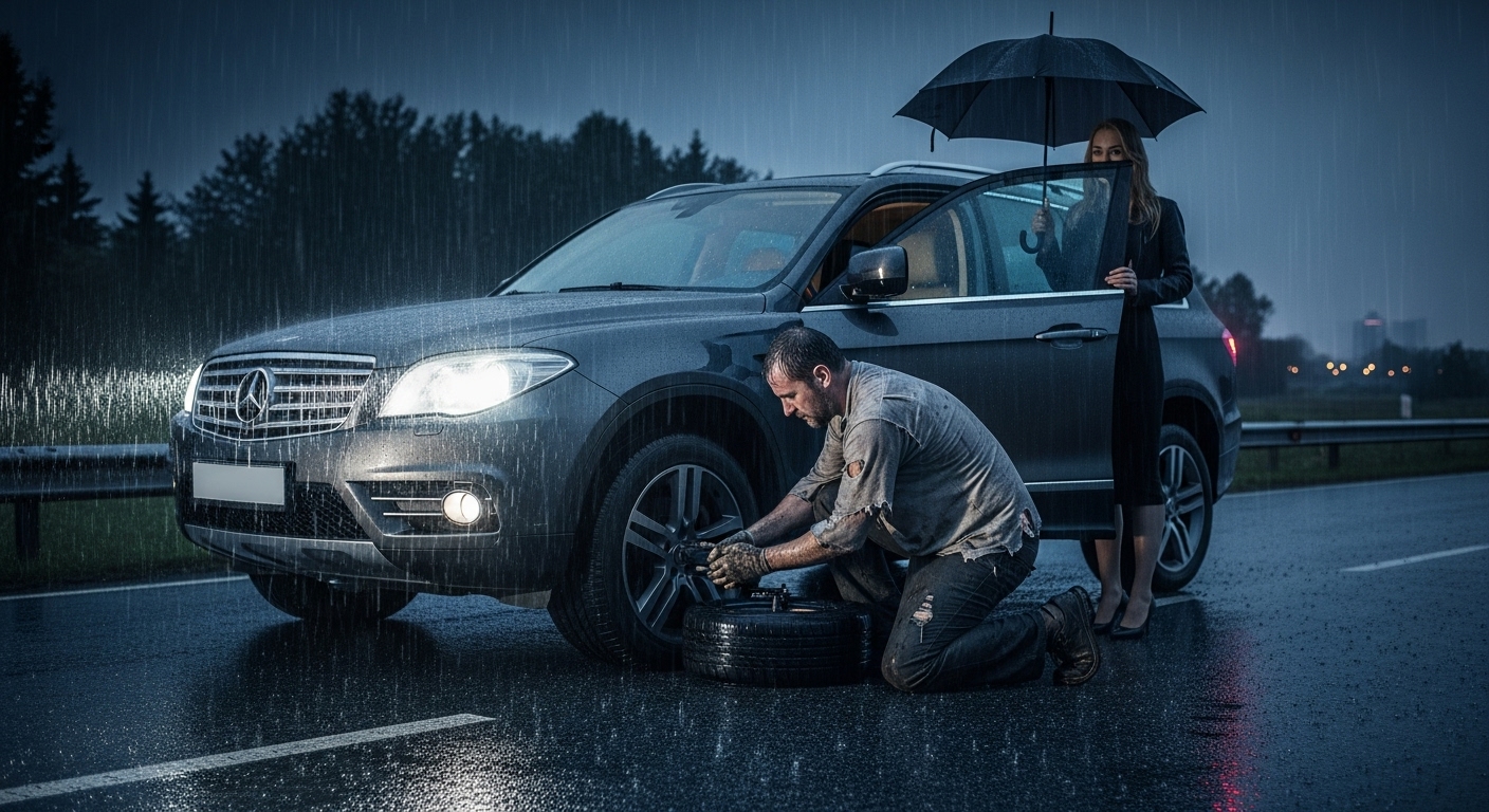“ISANG PULUBI ANG TUMULONG MAGPALIT NG GULONG NG ISANG LUXURY CAR SA GITNA NG KALYE — HINDI NIYA INASAHAN NA ANG MALIIT NA KABUTIHANG IYON ANG MAGBABAGO NG BUHAY NIYA HABANGBUHAY.”
