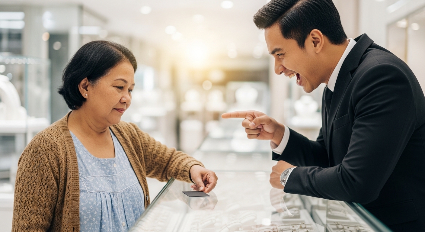 Hindi nagalit si Carmela. Nananatiling kalmado ang kanyang mukha. “Gusto ko lang namang bilhin ang kwintas na ‘yan para sa anak ko. Bawal ba akong bumili?”