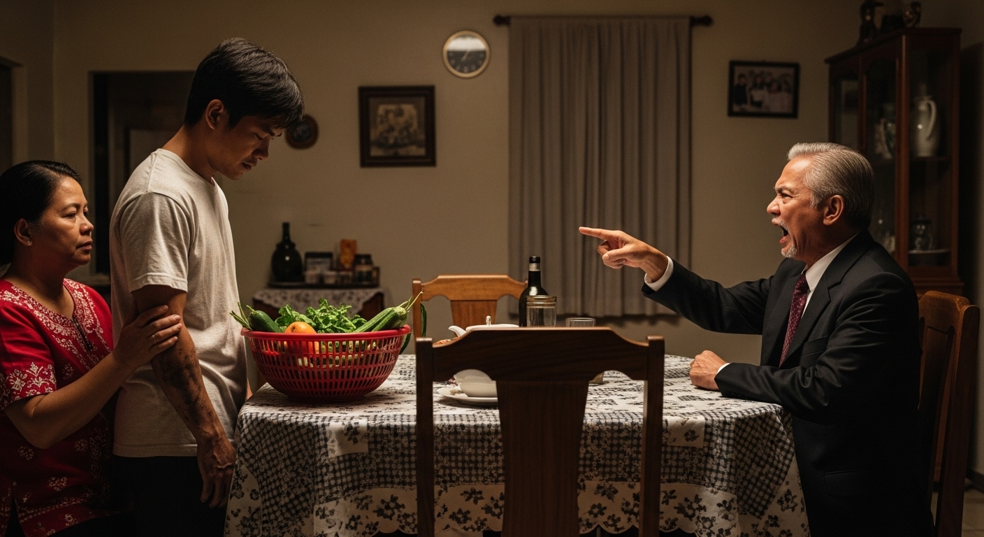 “Marangal? Pwe!” dura ni Rogelio. “Tignan mo ang anak ko, si Carla. Sanay sa aircon, pero dahil sa’yo, nagtitiis sa amoy ng gulay! Isa kang ‘A-K-K’Ang Kupad na Kalasag! Walang asenso! Wala kang kwentang asawa!”