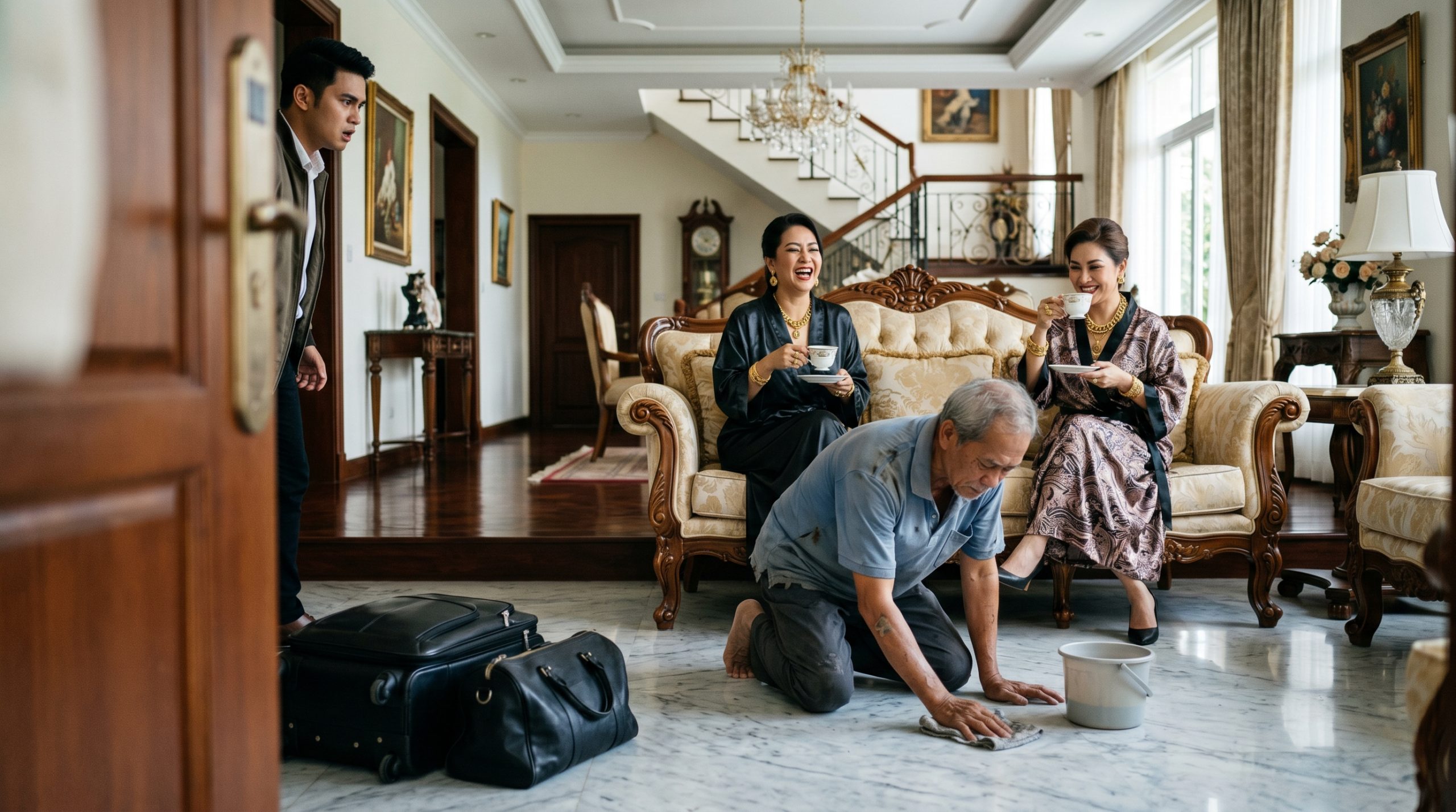 Doon, sa gitna ng malawak at malamig na marmol na sahig, nakaluhod ang aking ama na si Tatay Mando. Payat na payat siya, tila buto’t balat na lamang. Nakasuot siya ng isang labis na kupas at butas-butas na t-shirt, at nanginginig ang kanyang maliliit na braso habang pilit na kinukuskos ng basahan ang isang mantsa sa sahig. Tumutulo ang kanyang pawis at luha habang naglilinis.