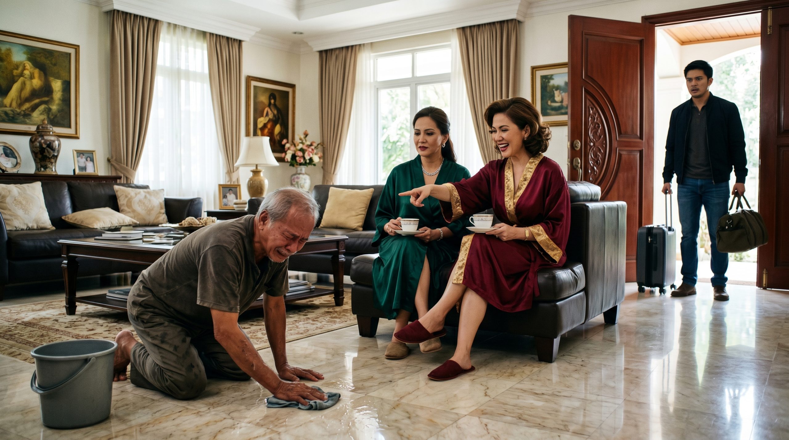 Doon, sa gitna ng malawak at malamig na marmol na sahig, nakaluhod ang aking ama na si Tatay Carlos. Payat na payat siya, tila buto’t balat na lamang. Nakasuot siya ng isang labis na kupas at butas-butas na t-shirt, at nanginginig ang kanyang maliliit na braso habang pilit na kinukuskos ng basahan ang isang mantsa sa sahig. Tumutulo ang kanyang pawis at luha habang naglilinis.
