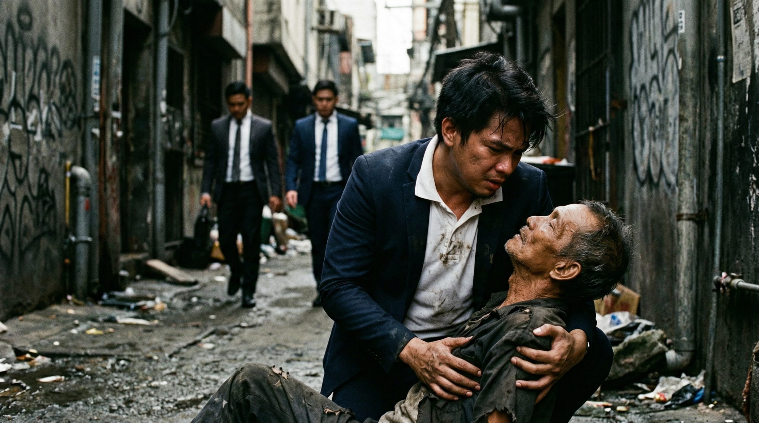 Isang matandang lalaki. Nakasuot siya ng isang napakarumi at punit-punit na damit, tila isang pulubi. Nakahandusay siya sa malamig na semento, hawak ang kanyang dibdib, at umiiyak sa matinding sakit. Nangingitim ang kanyang mga labi at may sugat siya sa noo dahil sa pagkakabagsak.