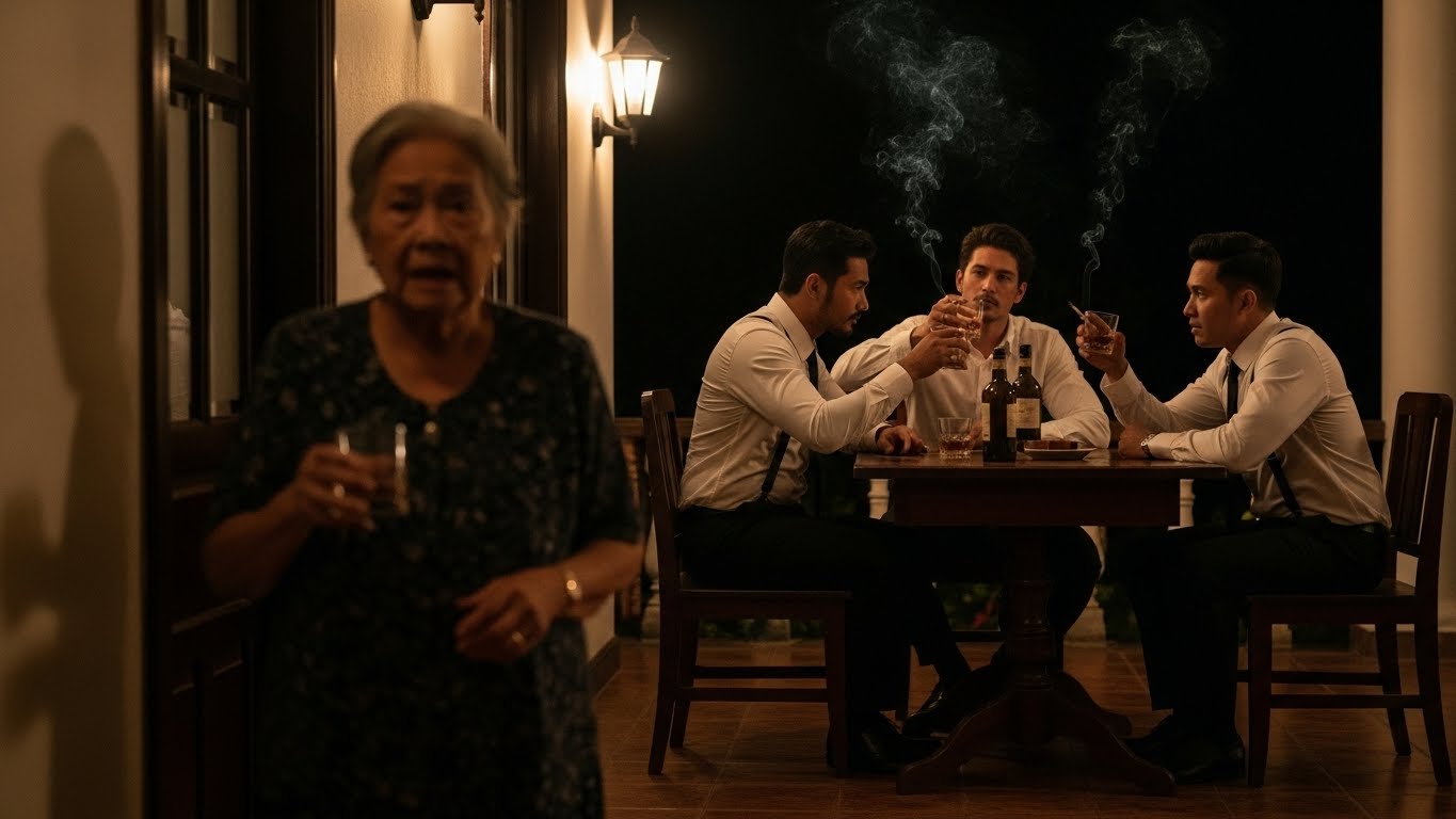 Habang naglalakad siya papunta sa kusina para kumuha ng gamot, nakita niyang bukas ang ilaw sa lanai (veranda). Nandoon ang tatlo niyang manugang—sina Rico, Mike, at Jeff. Nag-iinuman sila ng whisky at nagsisigarilyo.