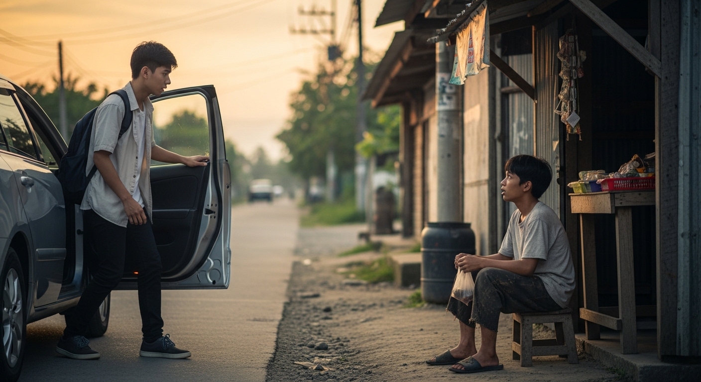 Habang bumababa siya ng sasakyan, may nakita siyang batang halos kaedad niya, nakaupo sa gilid ng sari-sari store, gusgusin ang damit at putik-putikan ang tsinelas. Payat, maputla, tila pagod sa buhay.