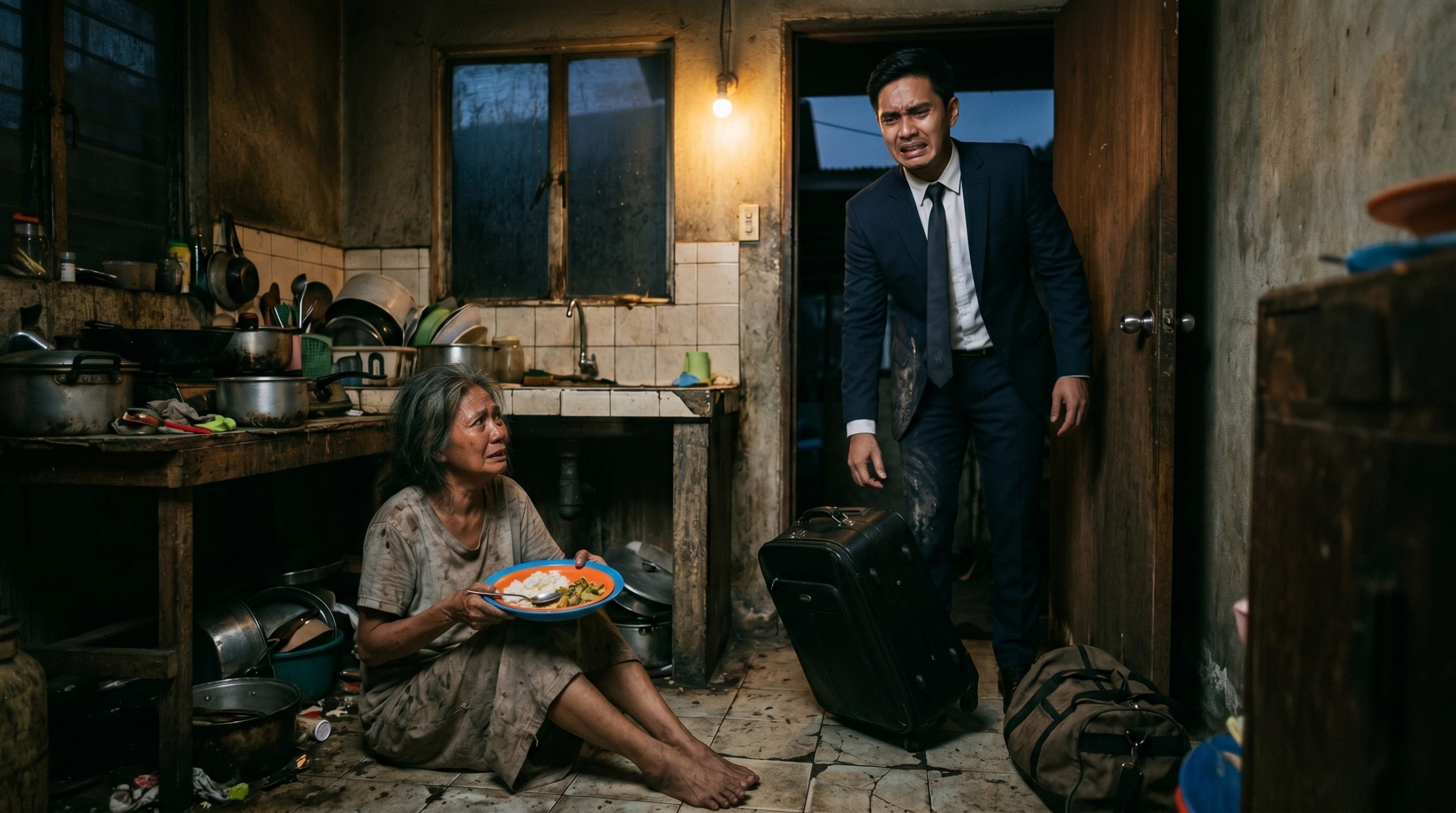 Doon, nakaupo sa malamig na semento ang asawa kong si Elara. Napakapayat niya, tila buto’t balat, at ang kanyang buhok ay magulo at mahaba. Nakasuot siya ng isang maruming daster. Nanginginig ang kanyang mga balikat habang mabilis na sumusubo mula sa isang basag na plastic na plato.