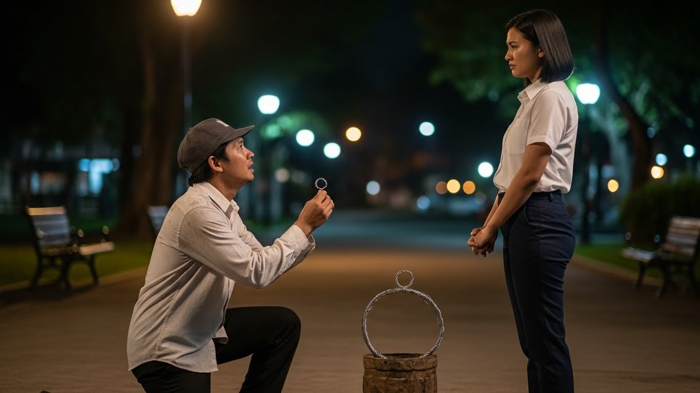Lumuhod si Kenzo at naglabas ng isang singsing na gawa sa alambre.