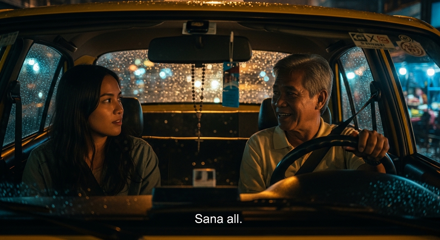 Habang nakasilong ako sa ilalim ng poste, pumarada sa harap ko ang isang dilaw na taxi — may amoy ng lumang air freshener at radyo na mahina ang tunog.