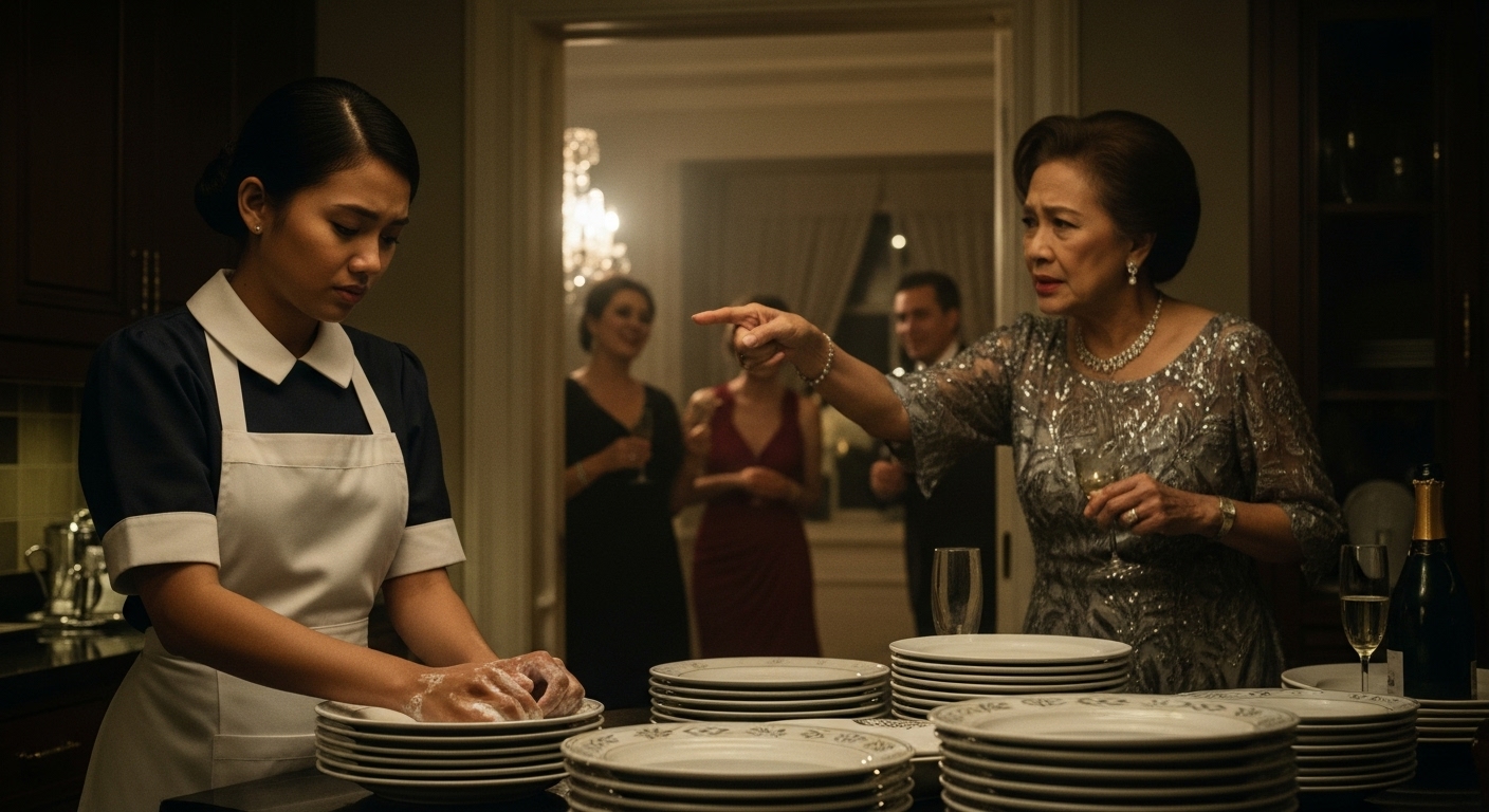 Habang nagsasaya ang lahat sa labas, kumakain ng steak at caviar, si Mia ay nakubli sa likod, babad ang kamay sa sabon at mantika.