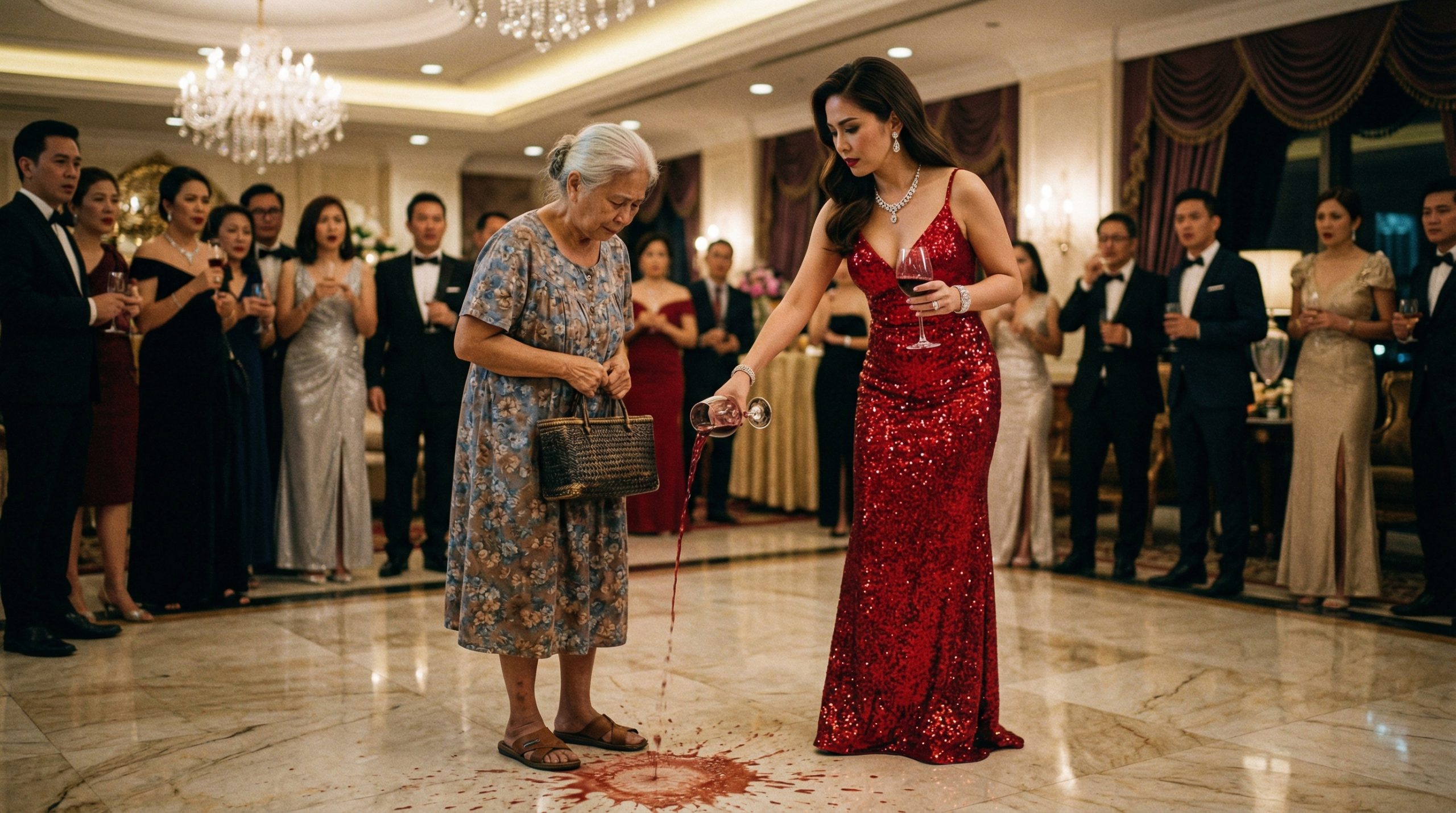 Bago pa matapos ng aking ina ang kanyang sasabihin, kinuha ni Stella ang isang baso ng red wine mula sa mesa at sadyang ibinuhos ito sa paanan ni Nanay Carmen. Tumalsik ang alak sa sapatos at laylayan ng kupas na bestida ng aking ina.