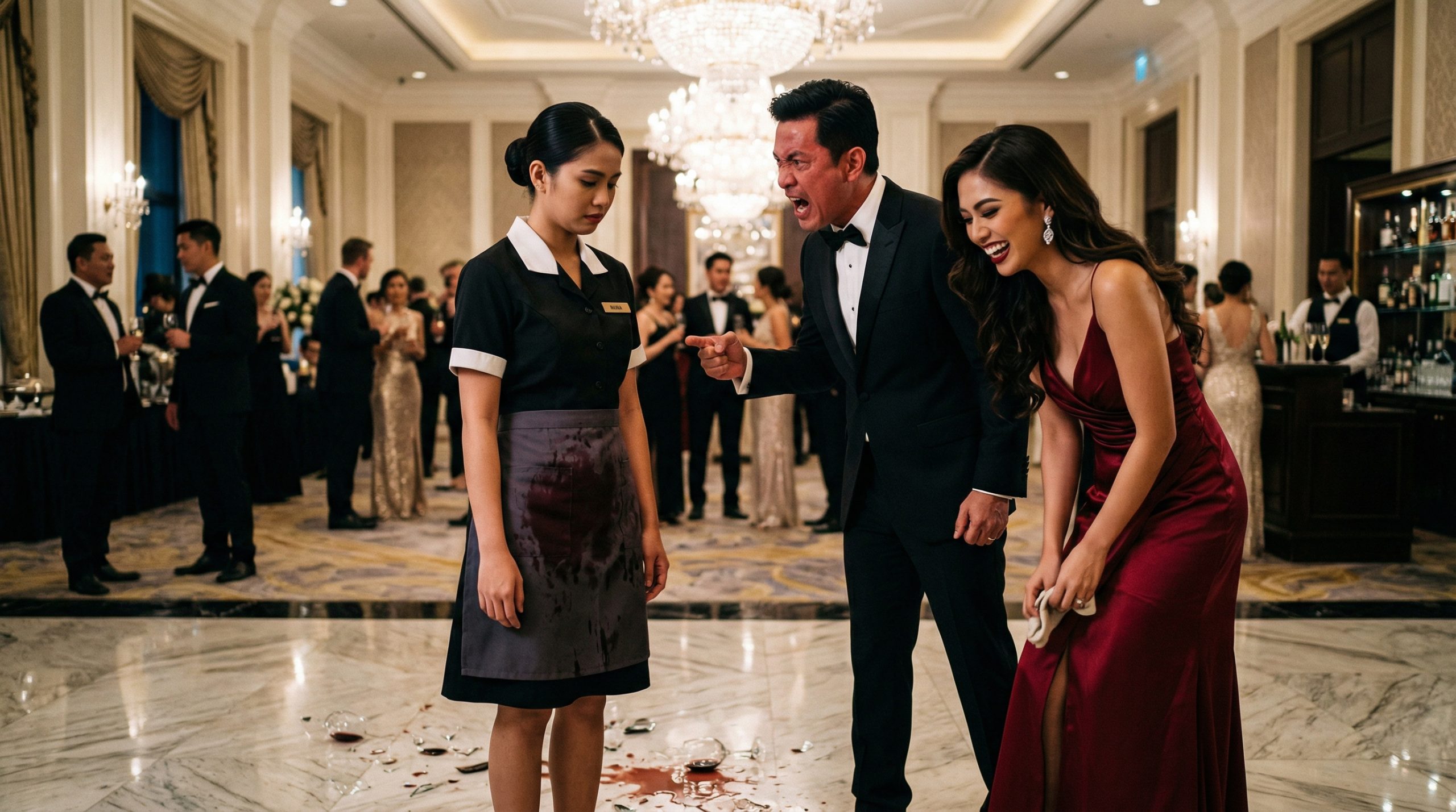 Sa halip na kunin ang baso, sinadya ni Stella na itabig ang tray na hawak ko.Ā CRASH!Ā Nabasag ang mga kristal na baso at tumapon ang red wine sa mamahaling sapatos ni Stella at sa aking uniporme.