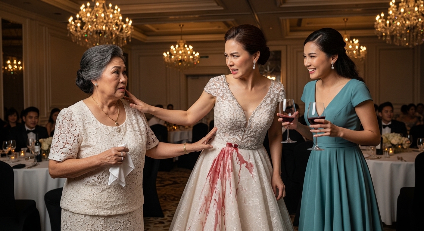 Habang kumakain, aksidenteng nasagi ni Nanay Lita ang baso ng wine. Natapon ito sa mamahaling gown ng Mommy ni Celine, si Donya Barb.