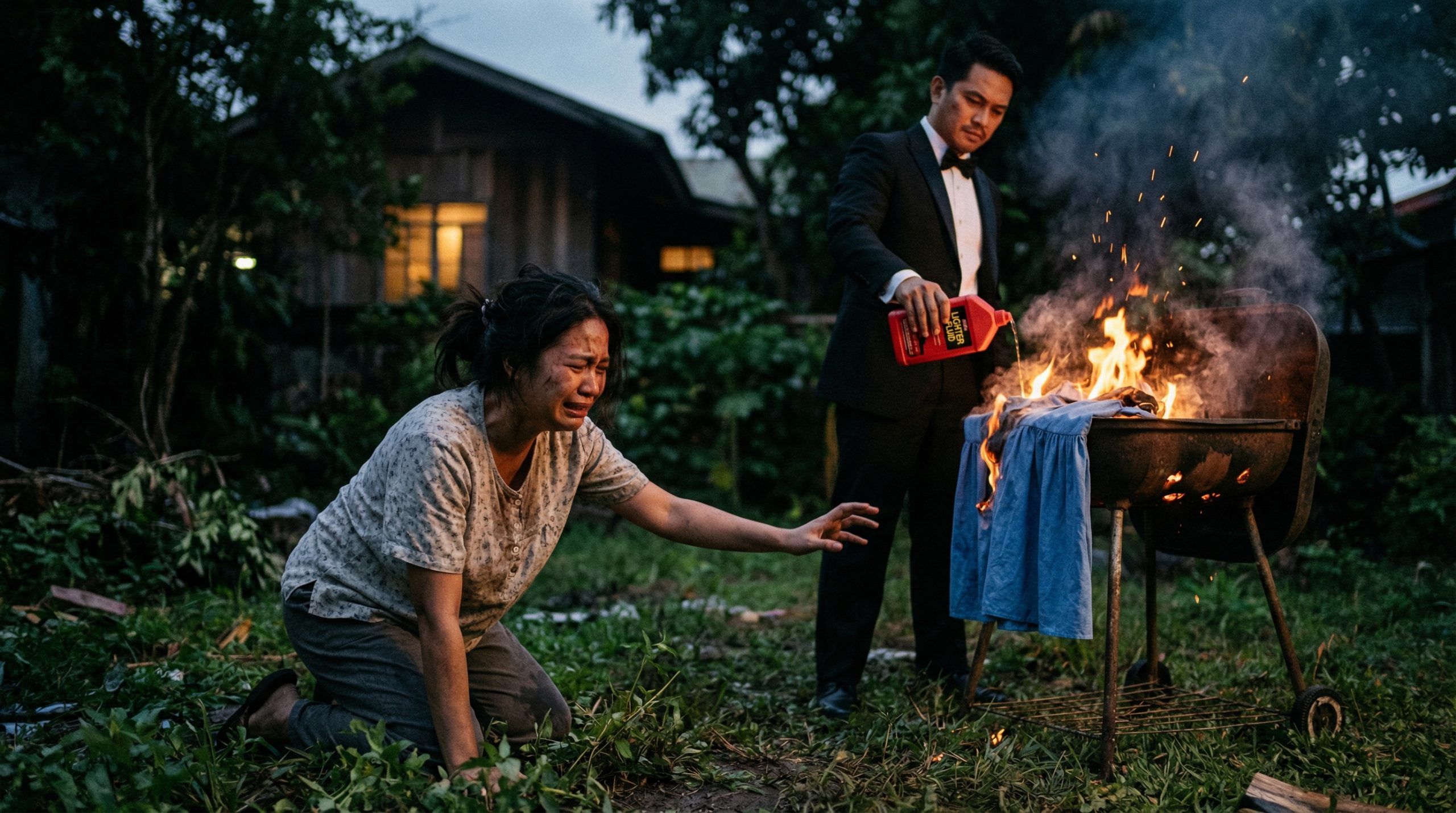 Kinabahan ako. Patakbo akong lumabas ng kusina. Doon, nakita ko si Marco na nakasuot na ng kanyang mamahaling tuxedo, nakatayo sa harap ng aming lumang ihawan (grill). Hawak niya ang isang bote ng lighter fluid, at sa ibabaw ng nag-aapoy na uling, sinusunog niya ang aking asul na bestida.