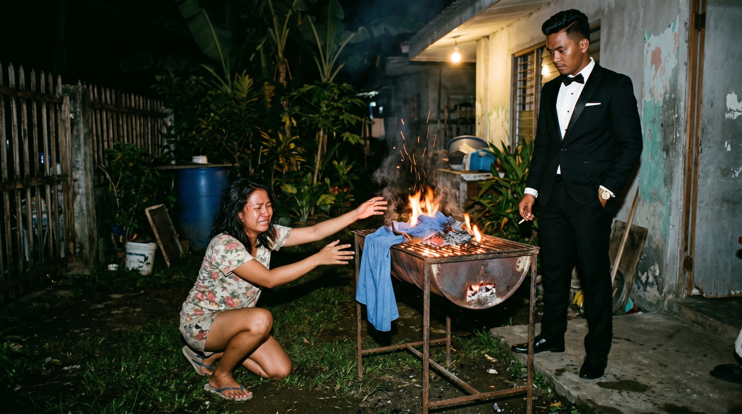 Kinabahan ako. Patakbo akong lumabas ng kusina. Doon, nakita ko si Leandro na nakasuot na ng kanyang mamahaling tuxedo, nakatayo sa harap ng aming lumang ihawan. Hawak niya ang isang bote ng lighter fluid, at sa ibabaw ng nag-aapoy na uling, sinusunog niya ang aking asul na bestida!