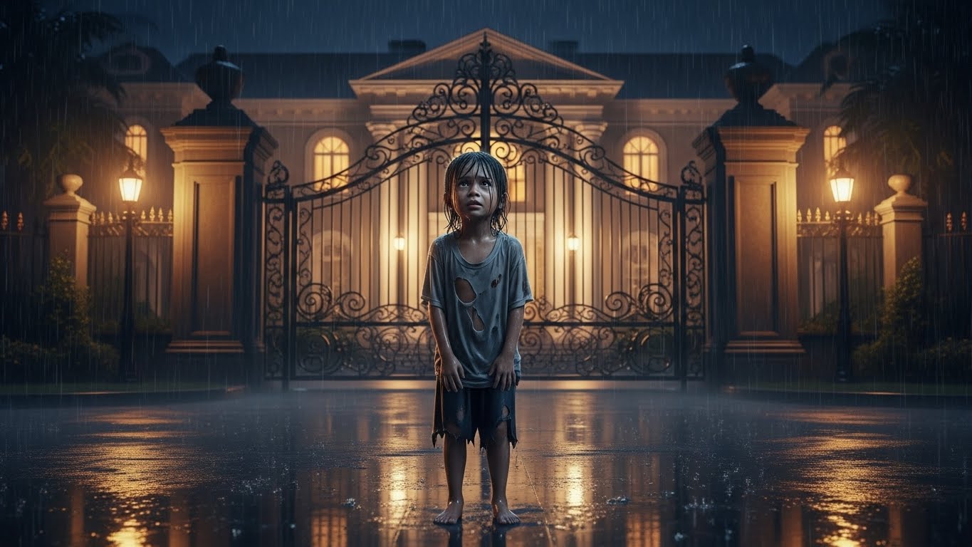 Isang batang babae, nasa edad walo, basang-basa, nanginginig sa lamig, at punit-punit ang damit.