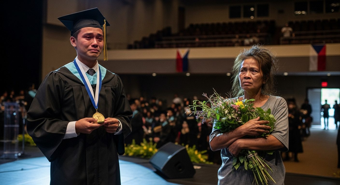 Sa likod ng mga ilaw at camera, nakita ko si Mama — nakatayo sa dulo ng hall, suot ang lumang bestida, hawak ang bulaklak na pinulot niya sa labas.