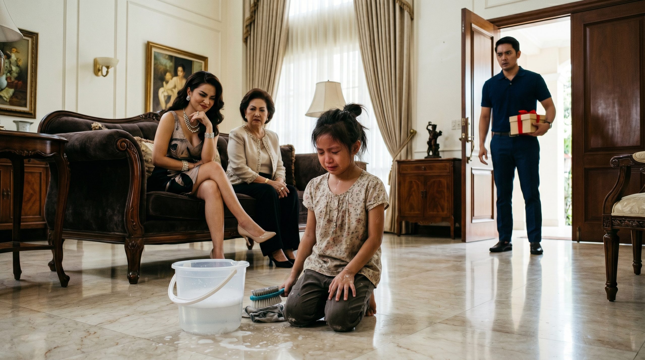 Doon, sa gitna ng malamig at matigas na marmol na sahig, nakaluhod ang aking siyam-na-taong-gulang na anak na si Maya. Nakasuot lamang siya ng manipis at lumang pambahay. Basang-basa siya ng pawis at maruming tubig. Ang kanyang maliliit at mapuputing kamay ay namumula na at nanginginig habang pilit na kinukuskos ang isang malaking mantsa sa sahig gamit ang isang magaspang na brush.