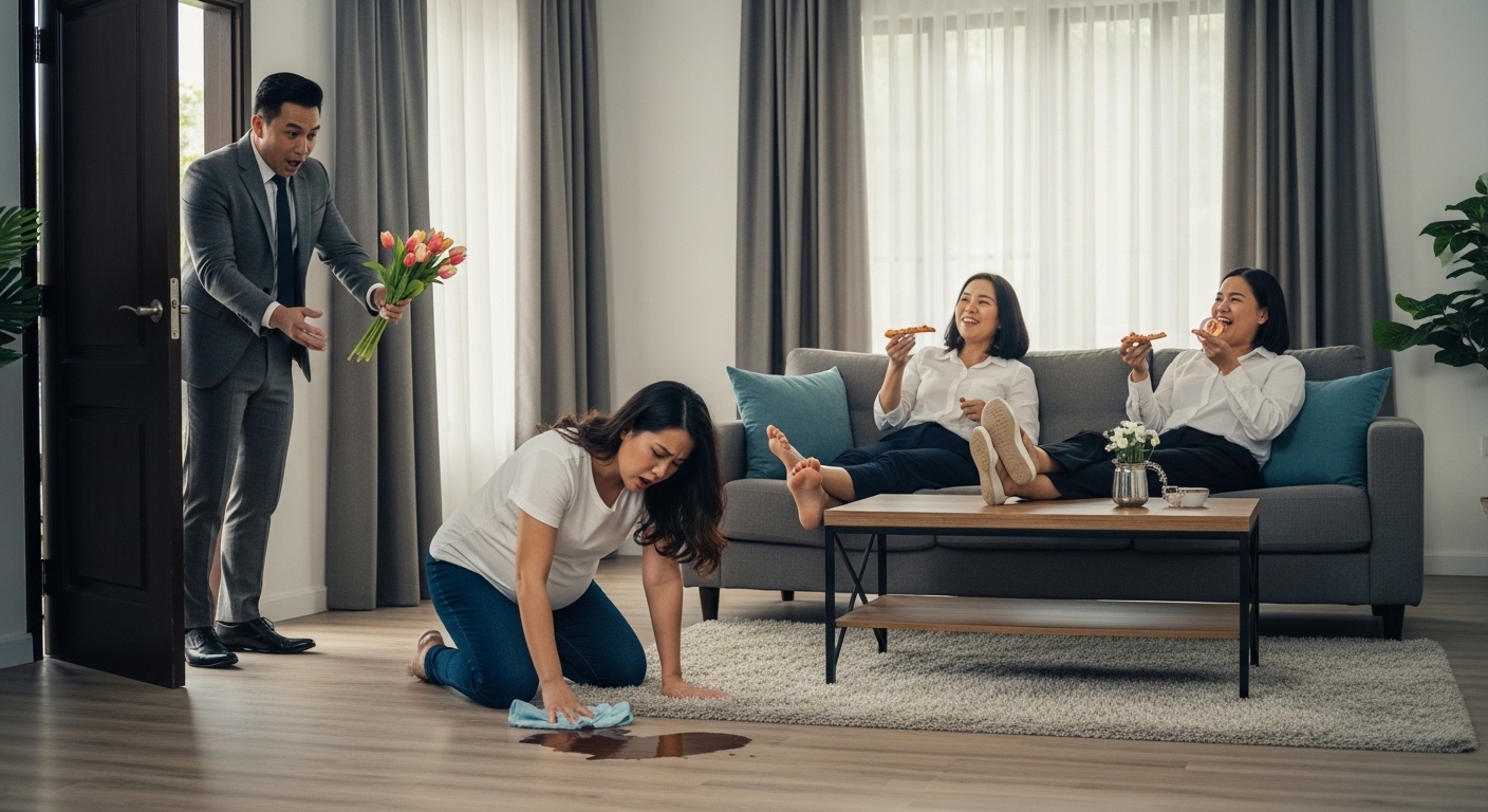 Sa gitna ng sala, nakaluhod si Mariel. Hirap na hirap siya dahil sa laki ng tiyan niya. Hawak niya ang isang basahan at pilit na nililinis ang mantsa ng kape sa sahig. Pawis na pawis siya at umiiyak.