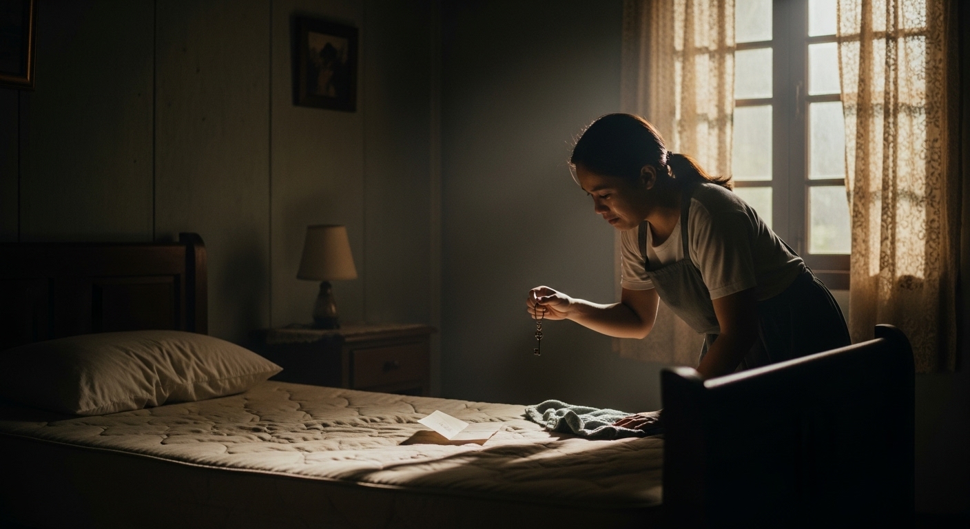 Tinanggal niya ito — at doon, may nakita siyang lumang sobre na nakatupi sa ilalim ng kutson, may pangalan niya.